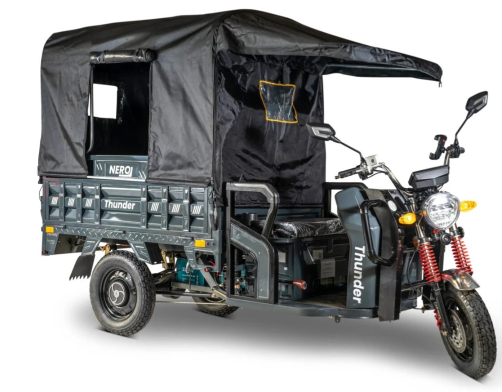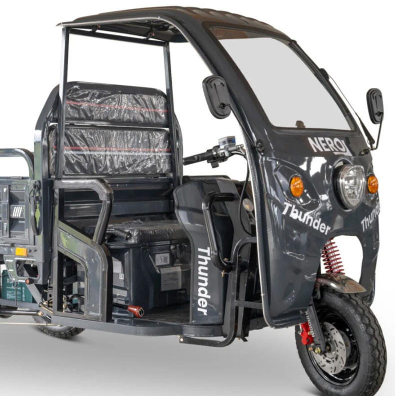 Das Elektro-Lastendreirad NERO Thunder ist optimal für jeden Betrieb, Hof oder einfach nur zum Spaß. Der Alleskönner ist mit einem 600W Elektromotor und einer großen und kippbaren Ladefläche, auf die problemlos 300 kg zugeladen werden können, ausgestattet. Die starke und langlebige 45 Ah-Batterie ist in 6-8 Stunden voll aufgeladen und bietet eine Reichweite von ca. 50-80 km. Die Maximalgeschwindigkeit beträgt 25 km/h, weshalb das Gerät gem. aktuellen gesetzlichen Vorschriften (in Österreich) wie ein Fahrrad eingestuft wird. Das heißt, dass Sie ohne Anmeldung auf allen Straßen fahren dürfen. Ein weiterer Vorteil des Geräts ist, dass der NERO Thunder auf der Hinterachse eine größere Luftbereifung montiert (4.00-12) hat.